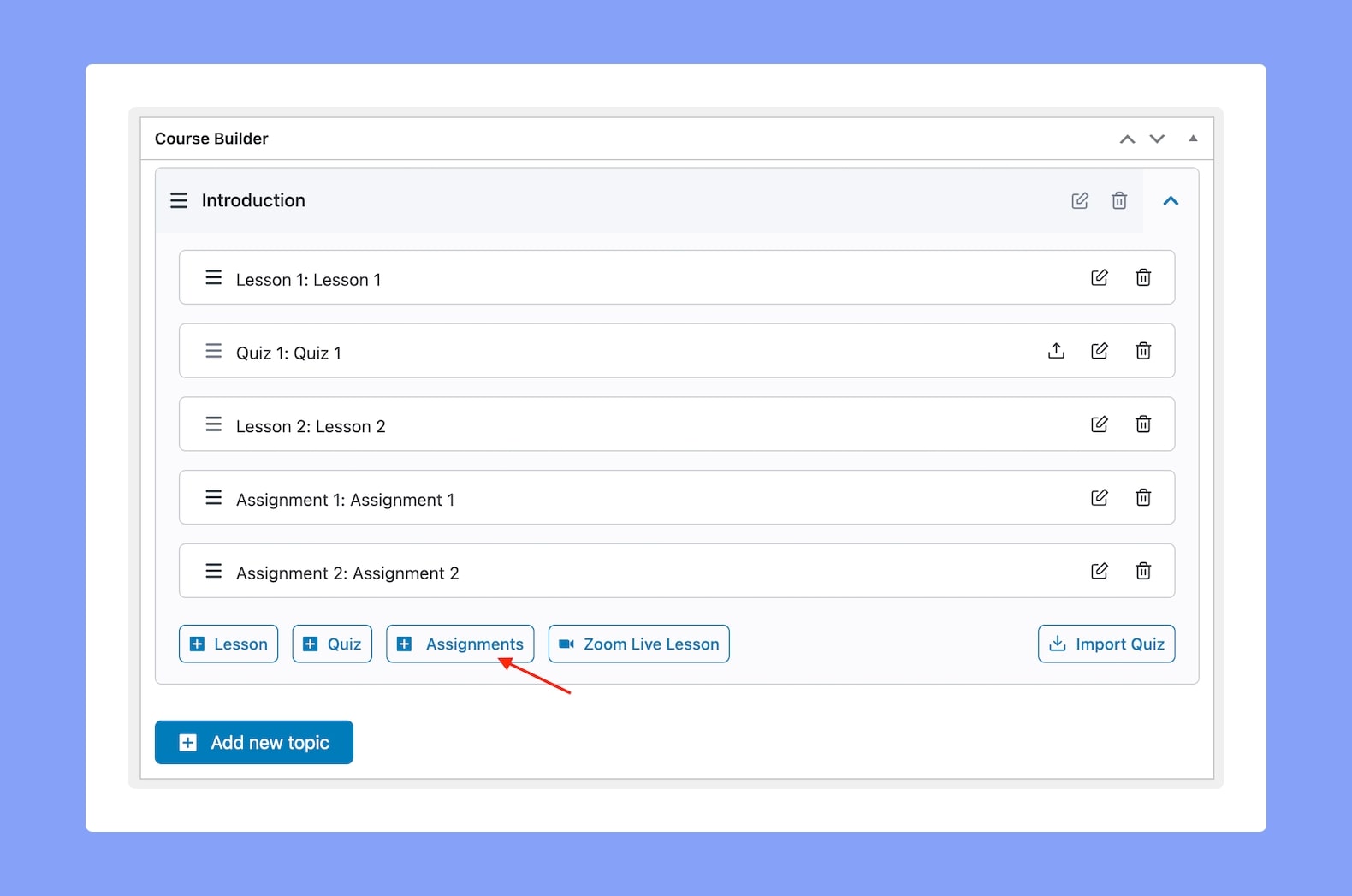 Navigate to any course and on the builder section, you will see a button named “Create Assignments”.
