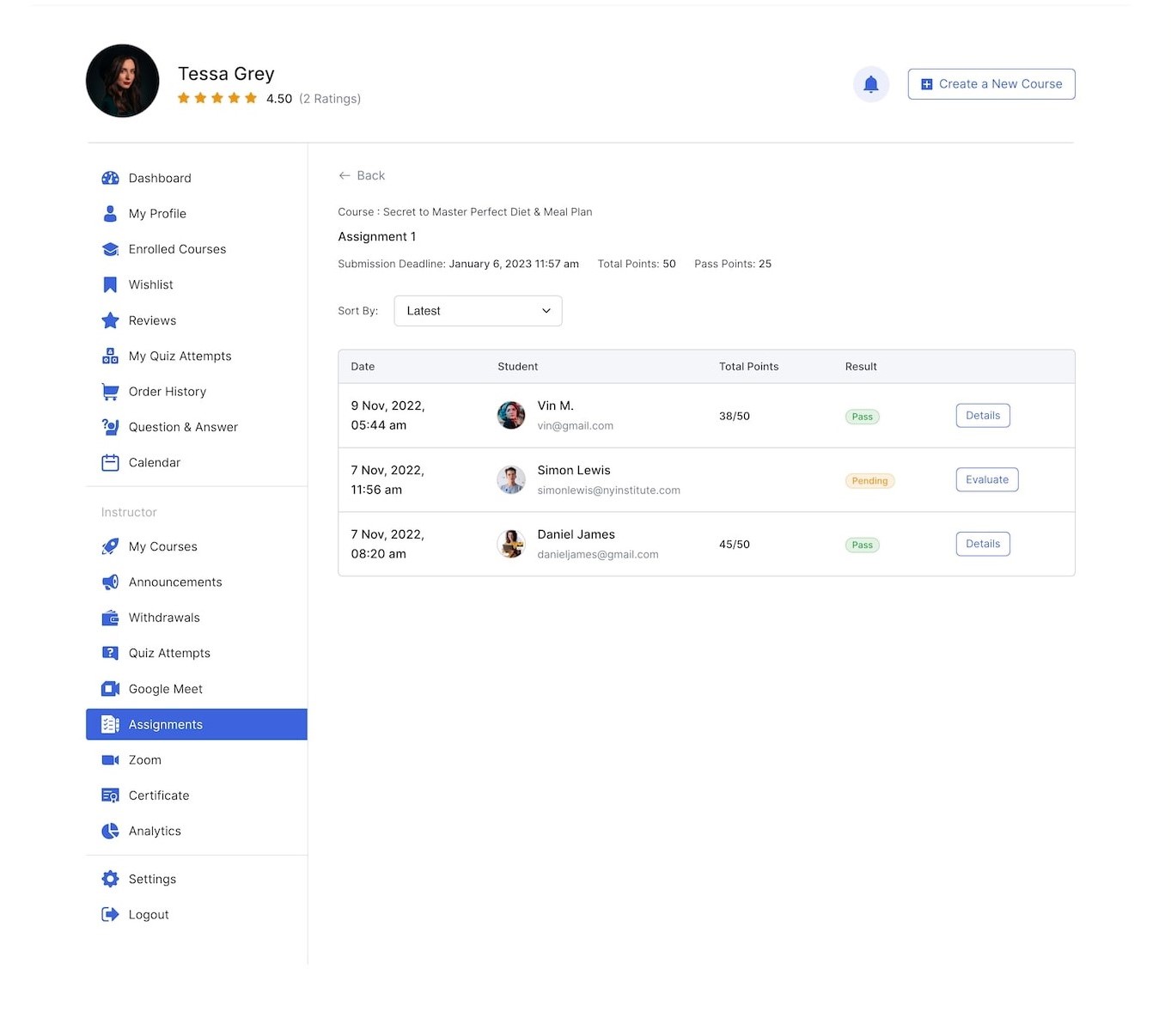 Once you’ve entered the Assignments Evaluation Panel, you’ll first be greeted with basic details about the Assignment like Course Name, Student Name, and Submitted Date.