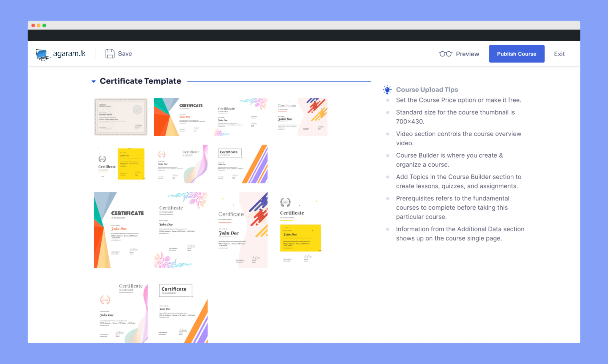 Agaram.LK’s certificate builder comes with pre-made certificate templates that are easy to customize and specially made with non-designers in mind. To get started, go to the Agaram.LK dashboard, navigate to Certificate and click on Create Certificate.