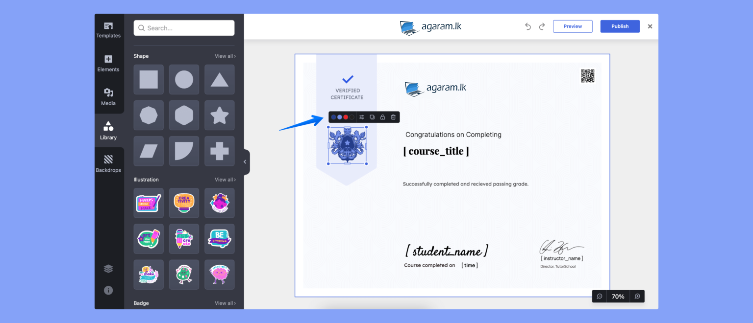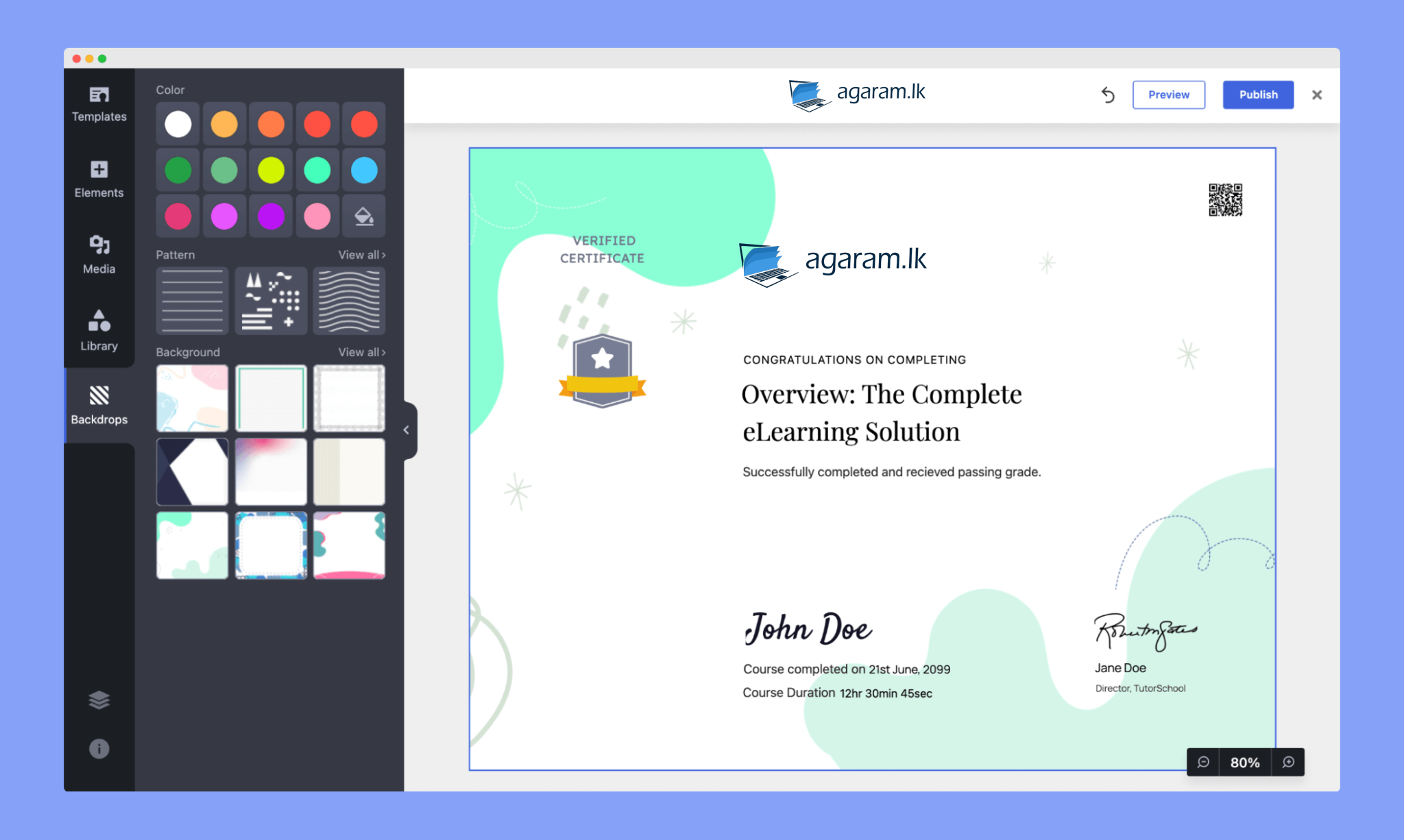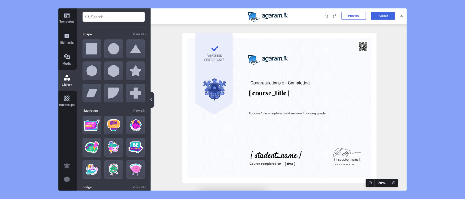 With the Agaram.LK Certificate builder adding backdrops is easier than ever now. You will be able to customize the colors of your certificate background, select specific patterns you want to add, or completely change the background from a premade background list.