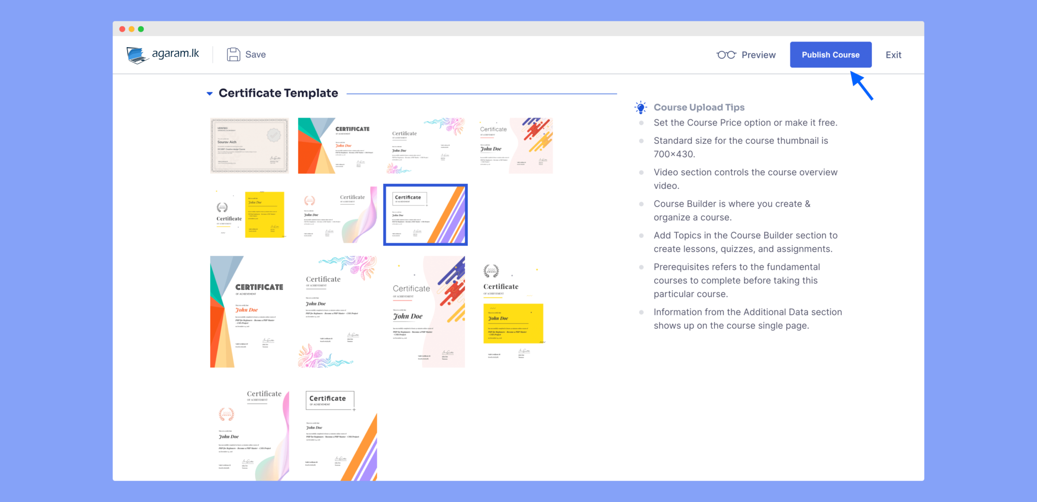 When you are done designing a certificate that reflects your course brand and quality, you need to assign the certificate to the course. Once you have completed the certificate design, hit the Publish button located at the top of the screen.