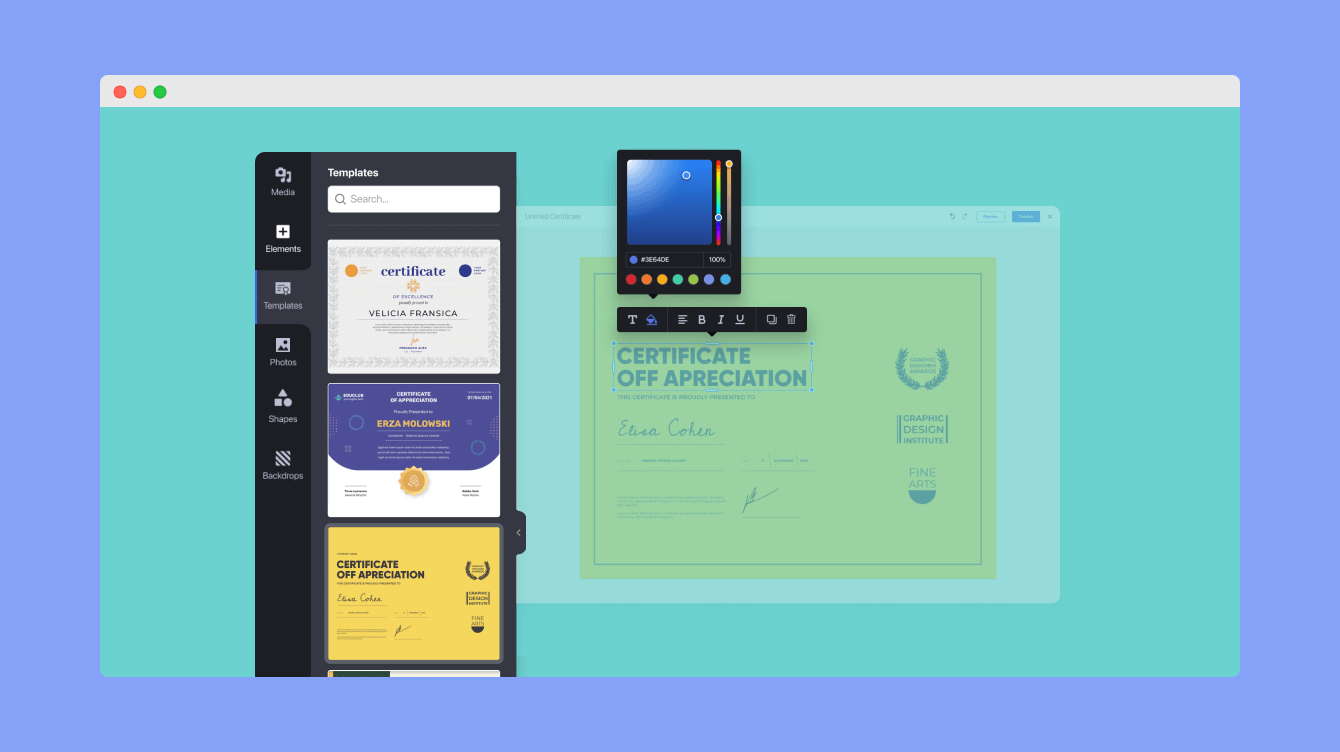 Colors: Choose from a wide range of colors for your certificate background and apply it directly to the certificate to see how it looks..