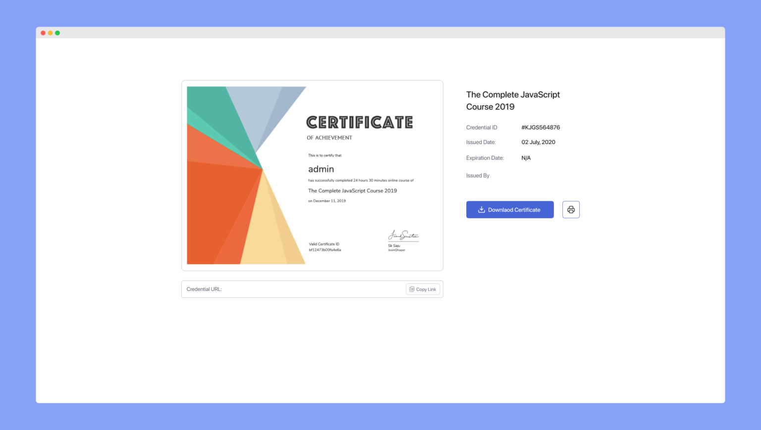Now, when a student successfully completes the course, the “Get Certificate” button will appear on the course home page. Upon clicking on the button, the student will be able to see the certificate preview as below.