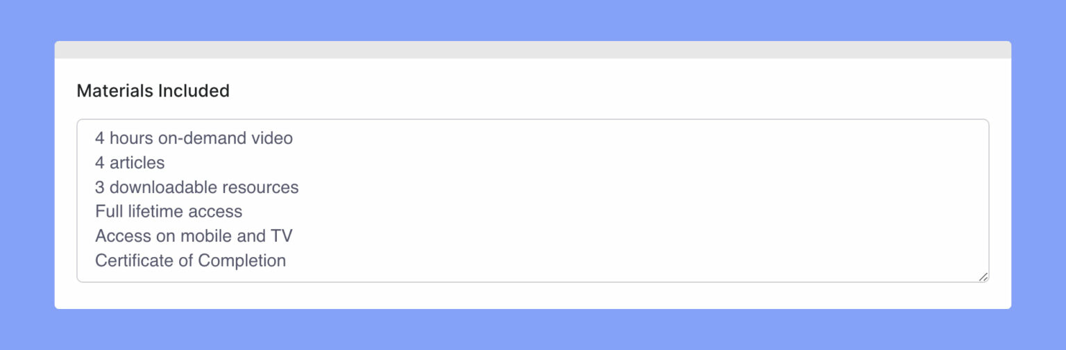 A list of assets you will be providing for the students enrolled in this course. (One per line)