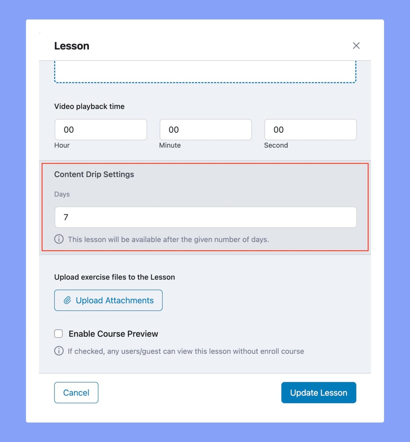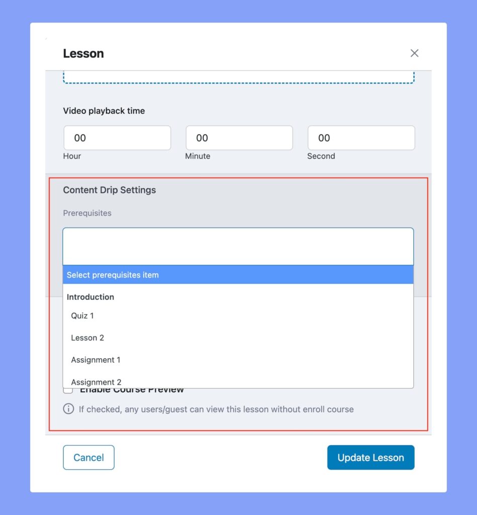 Enable Course Preview: If checked, any users/guests can view this lesson without enroll the course.