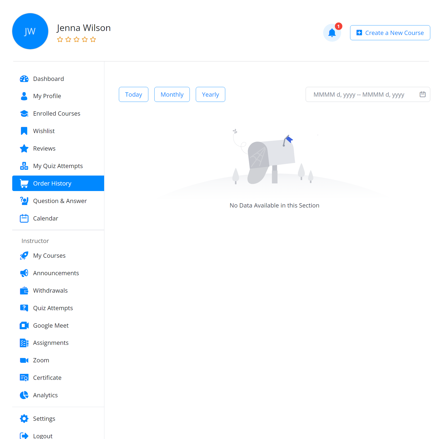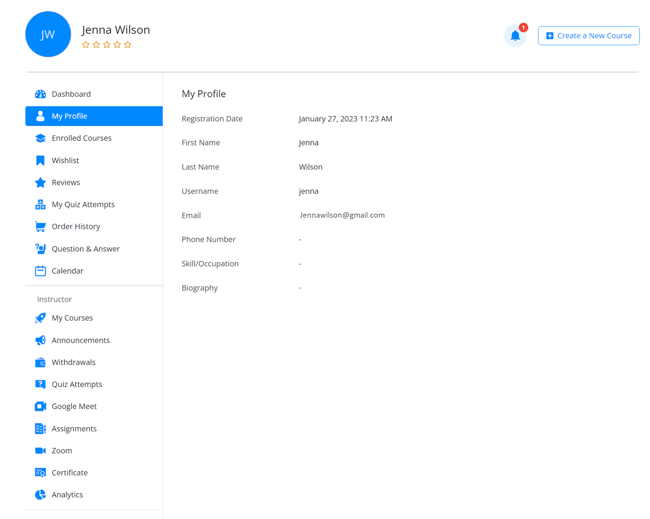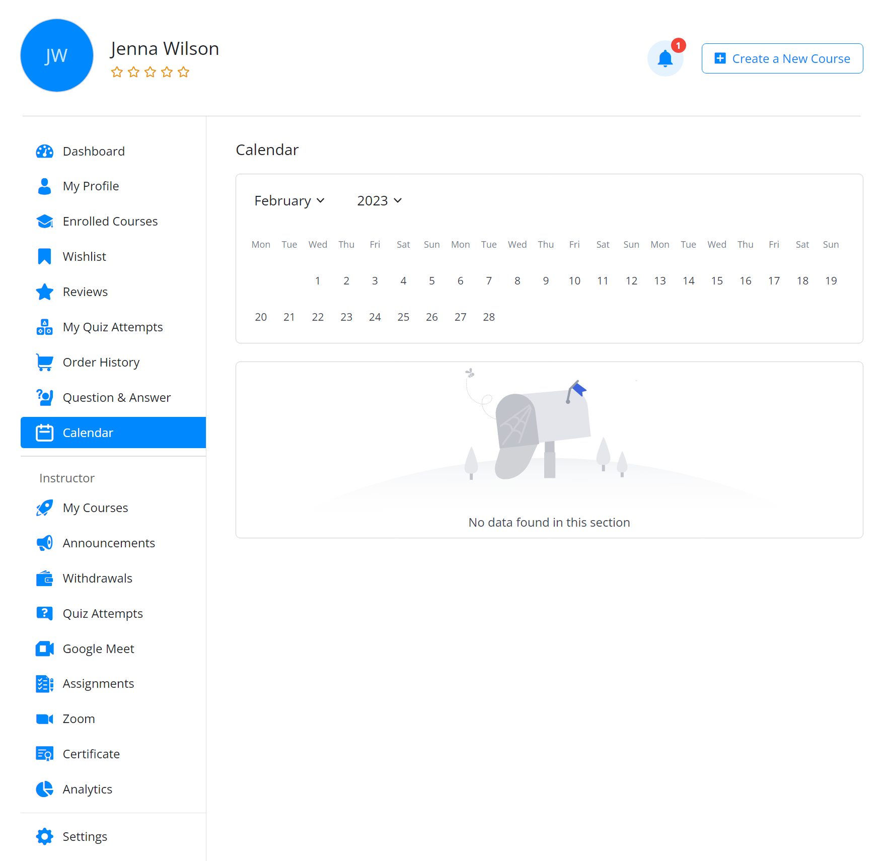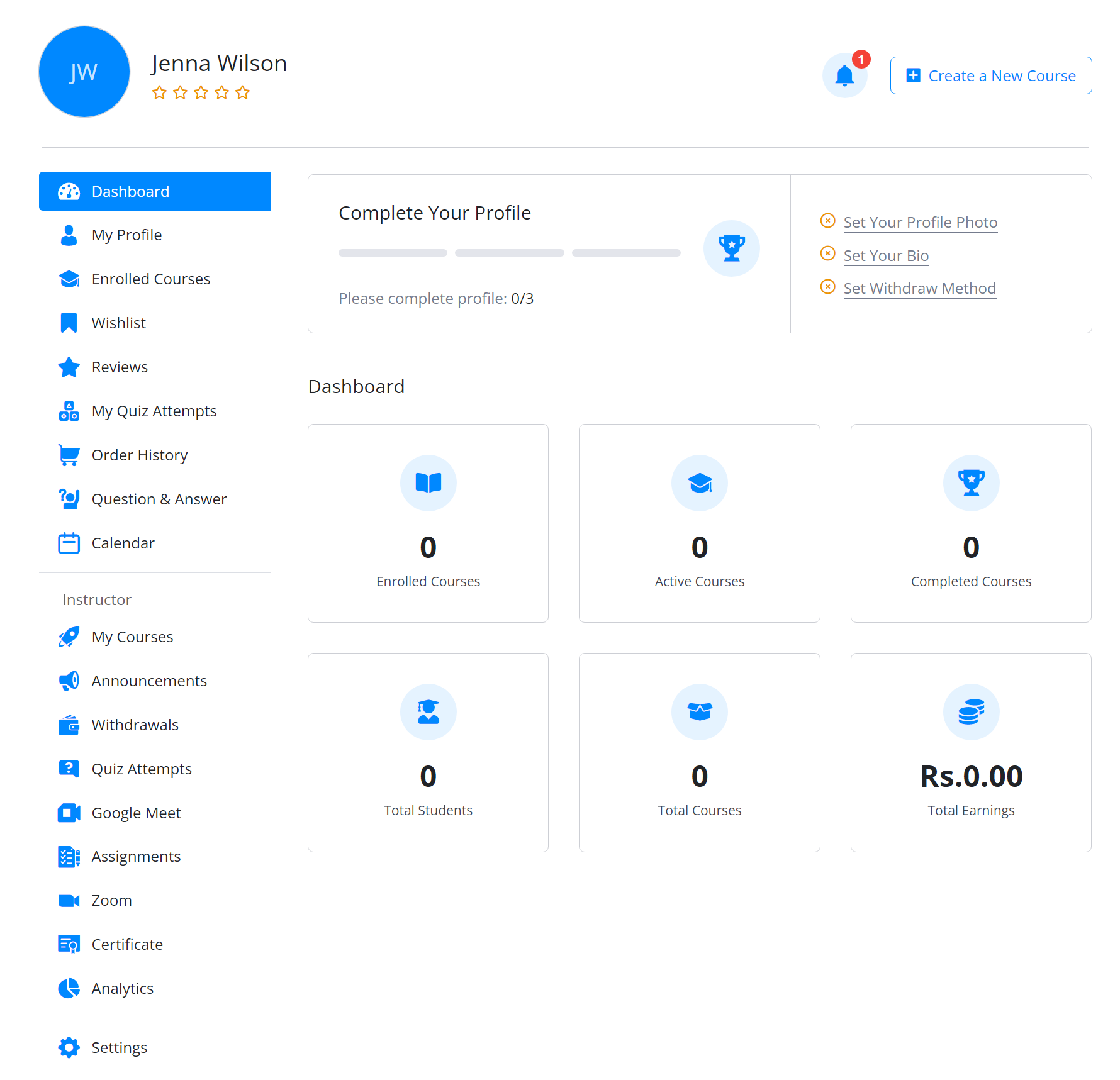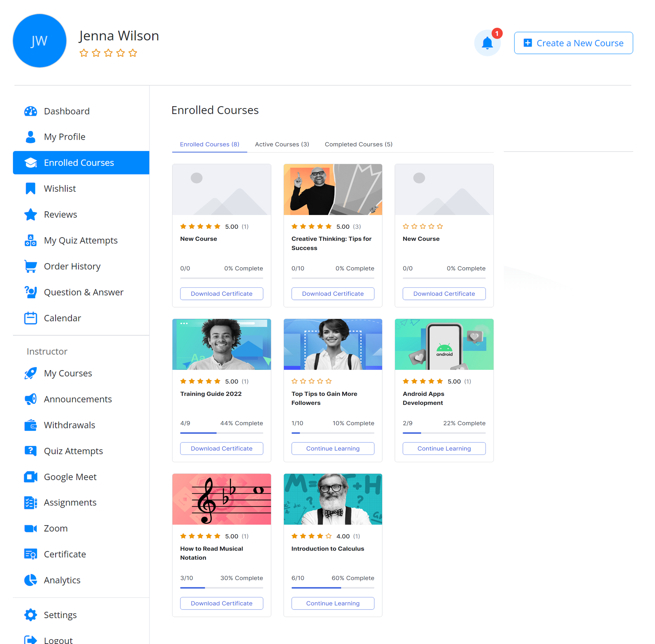 From here you can monitor all your stats of published or enrolled courses. It showcases all the courses that you have published for students to enroll in. Additionally, if you have enrolled in any courses as a student, those courses will also be displayed on this dashboard for easy access and management. This feature provides a one-stop-shop for instructors to manage their teaching and learning activities on the platform.