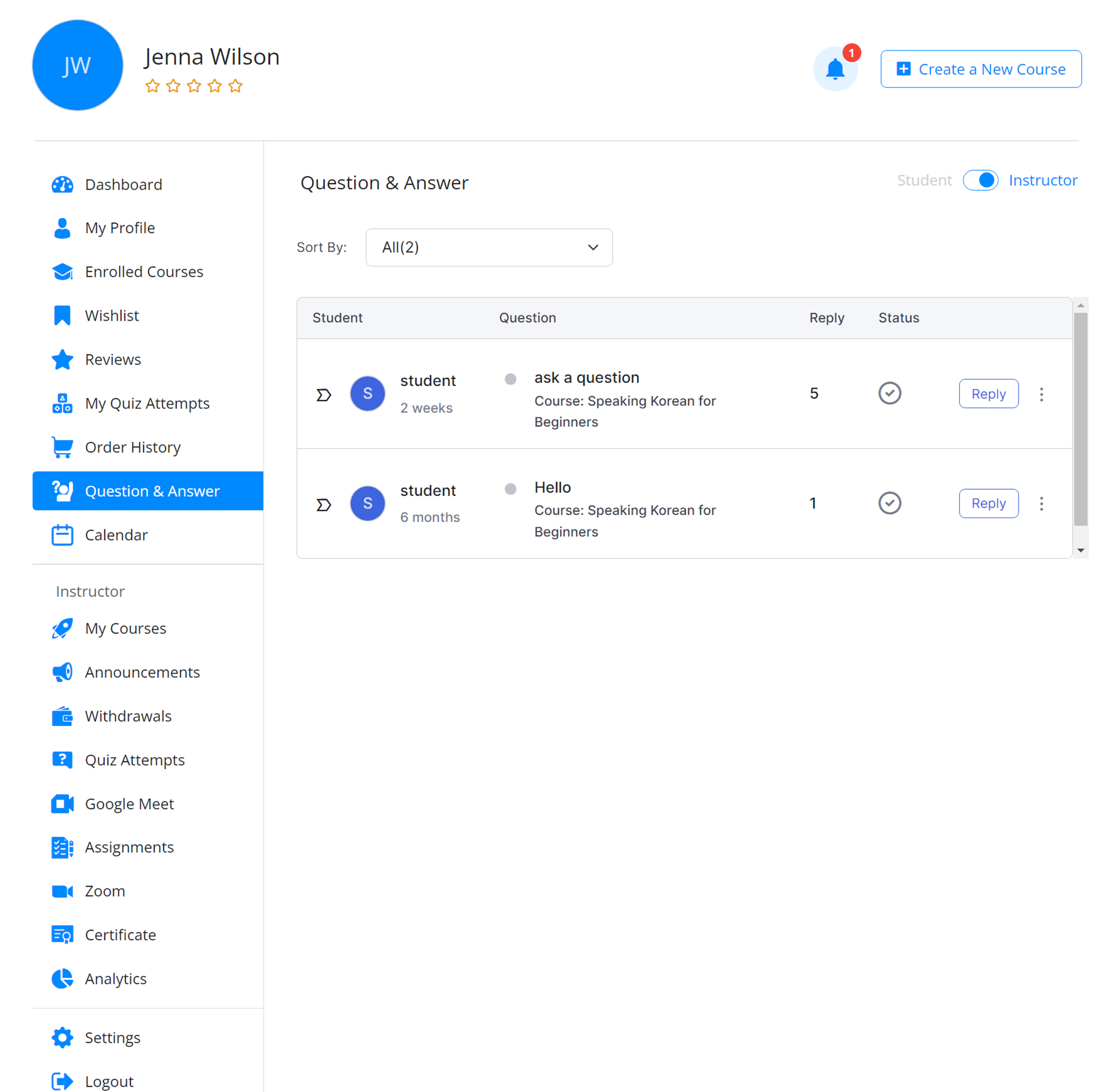 This Q&A dashboard allows you to manage and answer questions from your students in real-time. You’ll see the Q&As your students post on your courses and you can mark any conversation as Important by clicking on the arrow icon located on the left-most column.