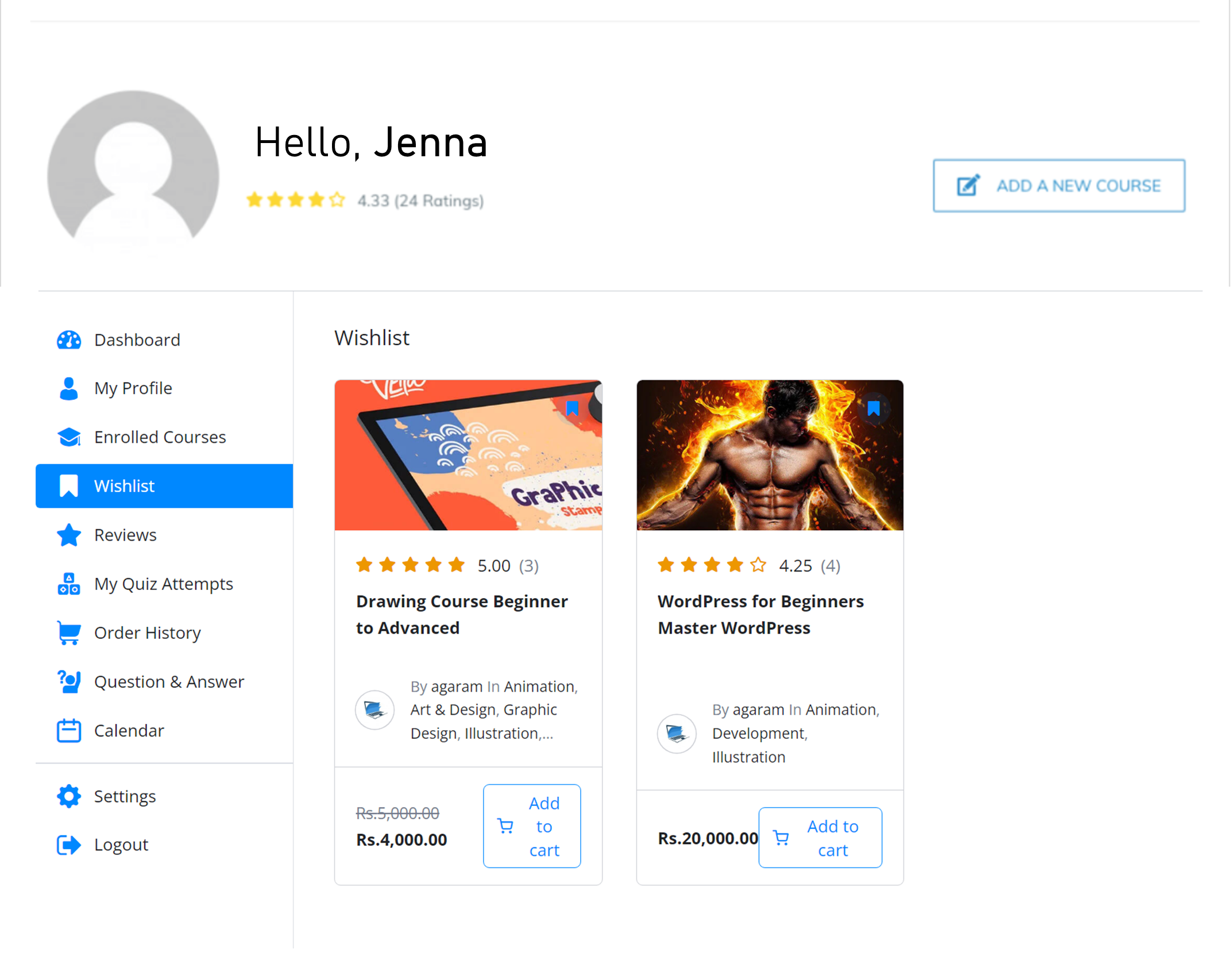 As a student you can add courses you like to your wishlist while you are browsing the courses. Just go to the dashboard and click Wishlist to view the courses you have saved. From here you can buy the courses that you already added to this wishlist, by selecting the “Add to cart” option.