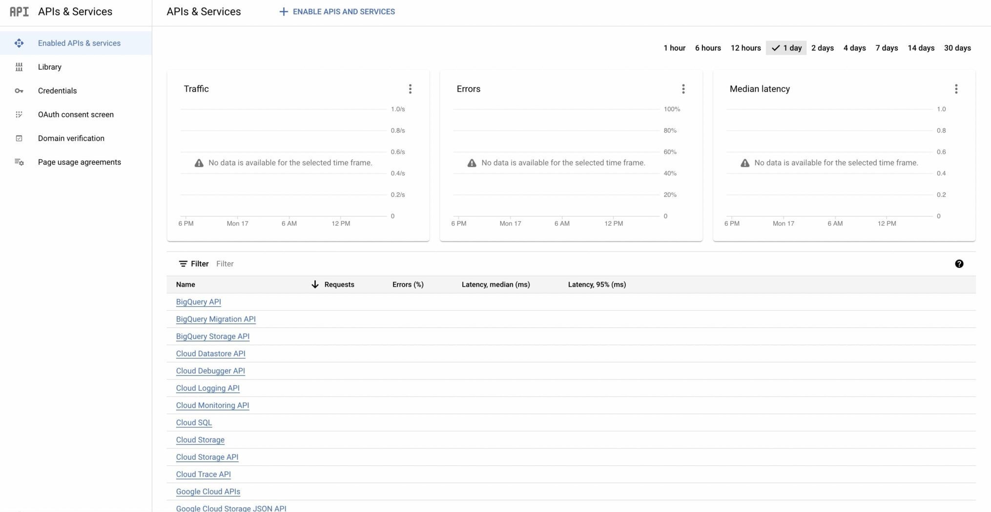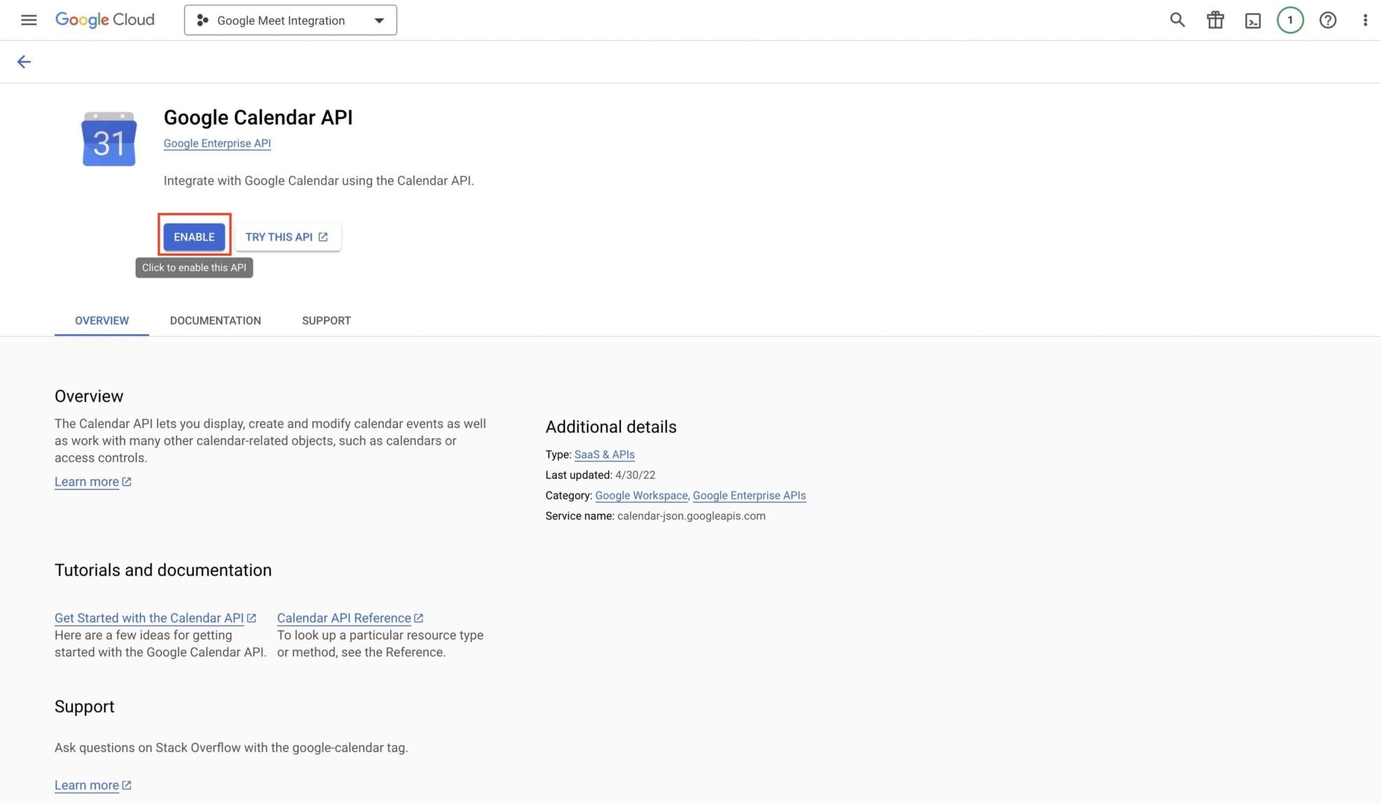After creating it, it will be selected as your project. From the Dashboard, click on Enable APIs and Services at the top. Then, from the search field that appears, search for Google Calendar API.