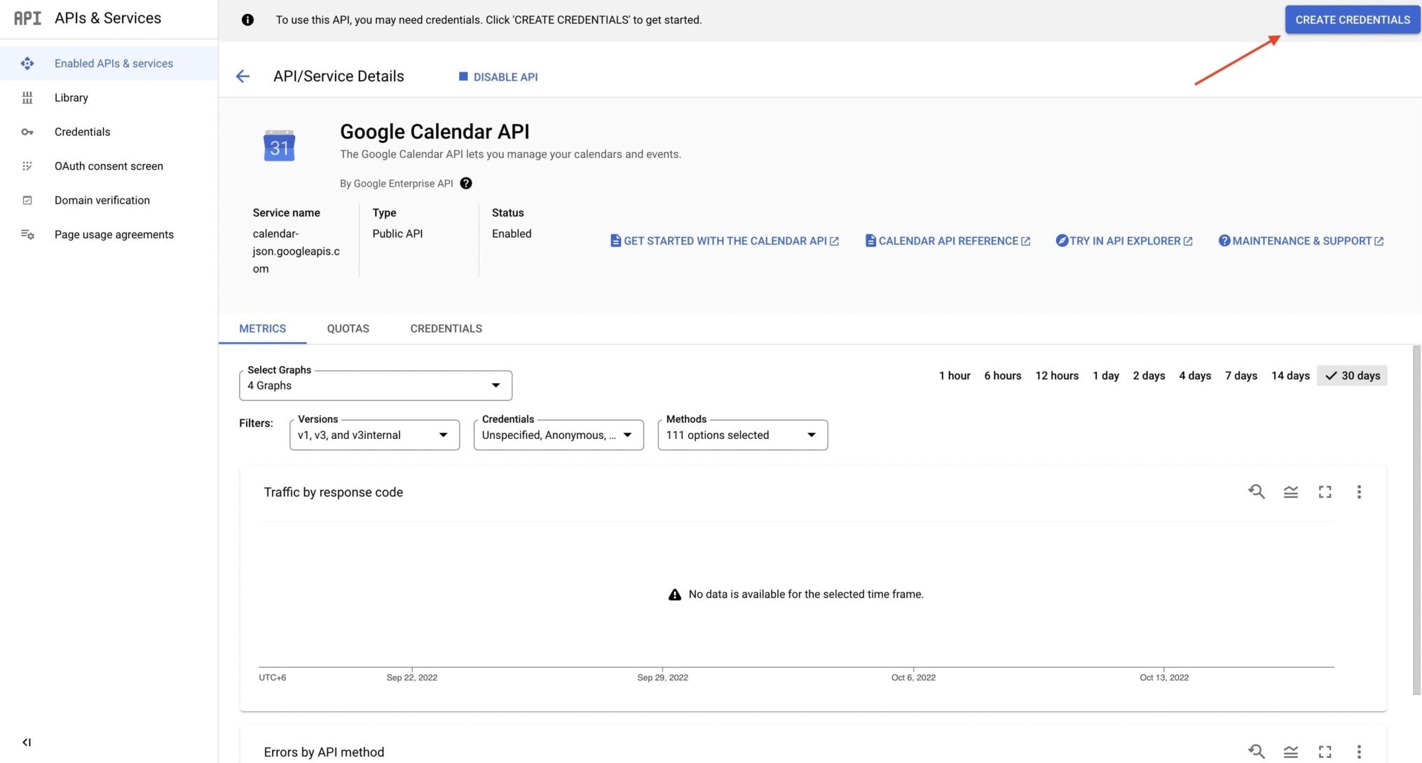 Then, from the Google Calendar API dashboard, click on create credentials.