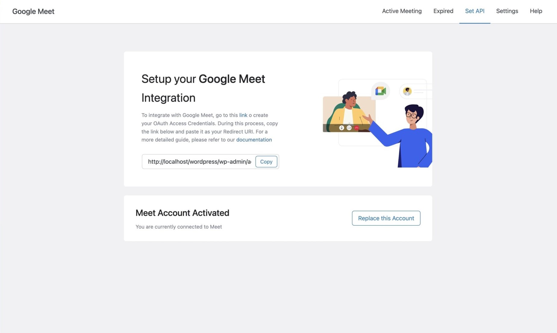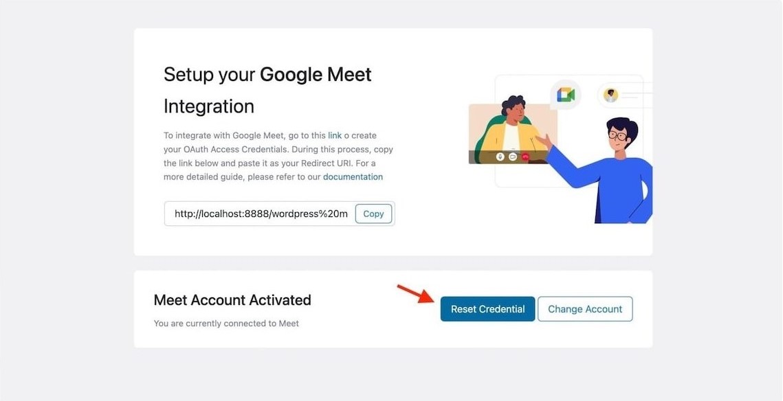 To find this button, head over to Google Meet > Set API. After clicking on Reset Credential, your currently connected Meet Account will get invalidated.