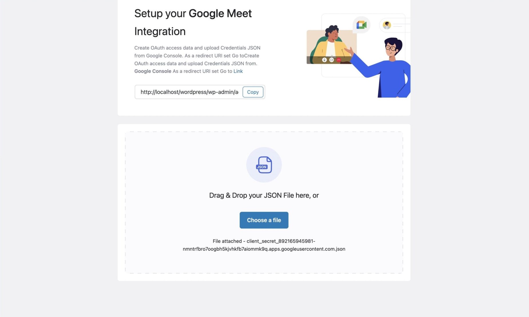 Here you will find a section to upload your JSON file, go ahead and upload the file. Once uploaded it will authenticate your website with the API credentials.